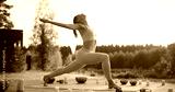 Young Woman Practices Yoga Outdoors in a Serene Forest, Body Flowing Gracefully Through Poses. Surrounded by Nature and Ritual Bowls and Candles, She Finds Peace and Balance in Tranquil Setting