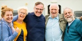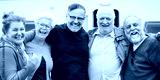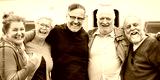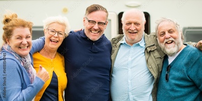 Group of five older adults smiling outdoors. They appear happy and relaxed, enjoying each other's company. Casual clothing and cheerful expressions. Cheerful senior people in nature.