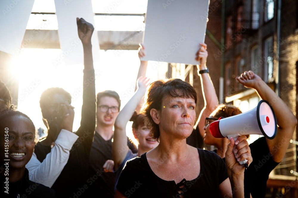Woman with megaphone in diverse group of people holding protest signs. Group of various ethnicity people united in protest. Woman with megaphone with diverse people in protest with blank paper signs