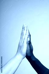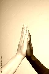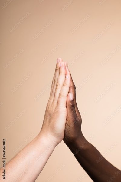 Two hands, of different skin color tones, high-fiving. Hands in unity, symbolizing diversity and teamwork. High-five gesture showing diversity and unity. Diversity and teamwork with high five.