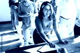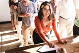 US election day, woman at reception desk with diverse people wait in line to vote at US election station. Diverse people wait in line to vote at US election day. Vote for American democracy.