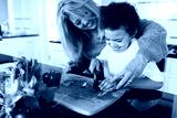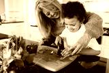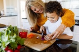 Happy woman helps child chop vegetables in a kitchen. Mother and son preparing food together. Fresh vegetables on the counter.