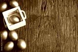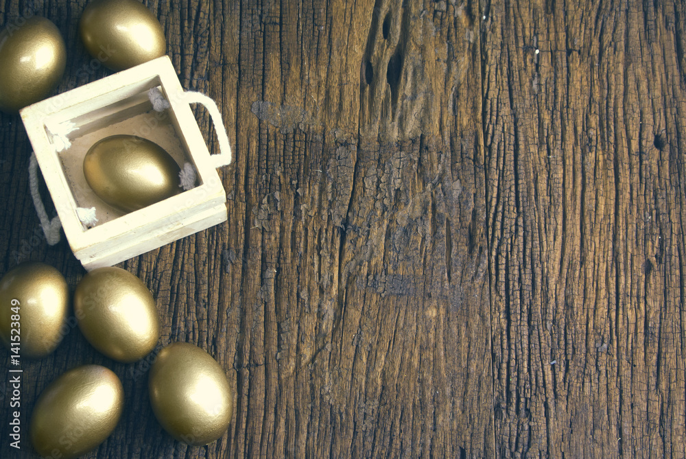 golden eggs and wooden texture with wood box