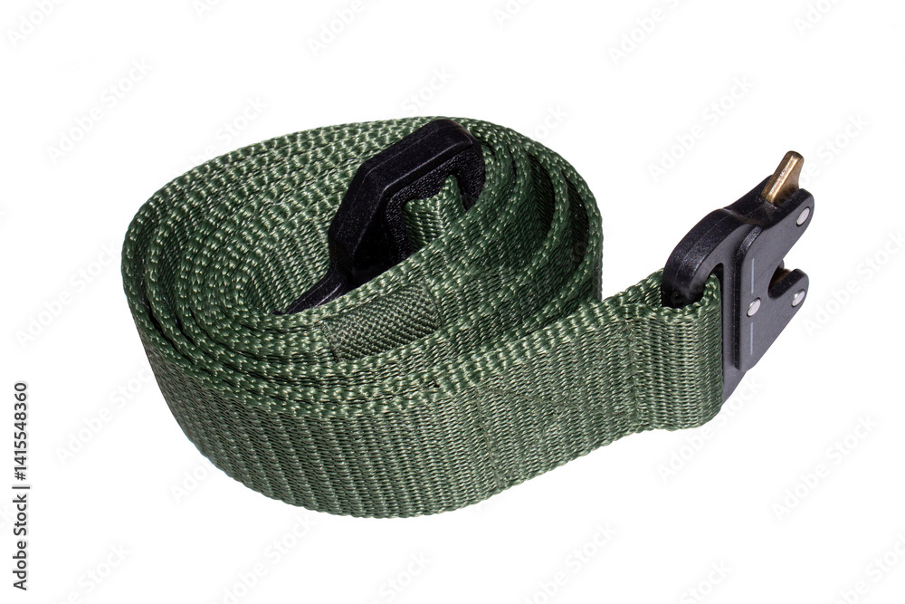 Tactical olive-colored belt on a white background.Nylon army olive waist belt.A belt with a molle system and a cobra clasp.