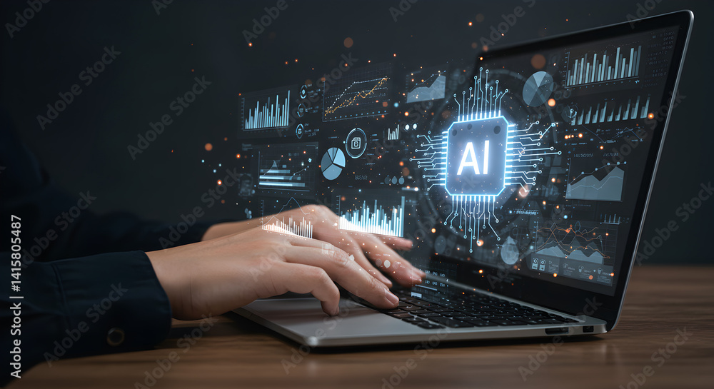 Professional workspace, business strategy, financial growth person typing on laptop with ai interface and data visualizations displayed on the screen in dark setting