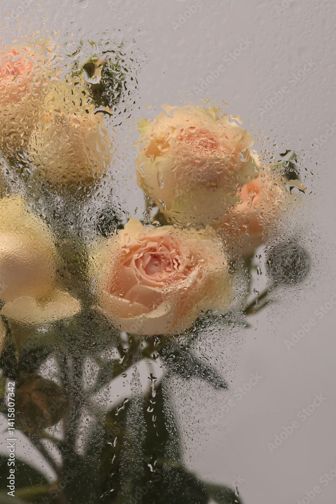 Soft focus cream beige rose flower bouquet through glass with wet water drops. Abstract natural blur background.