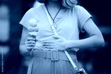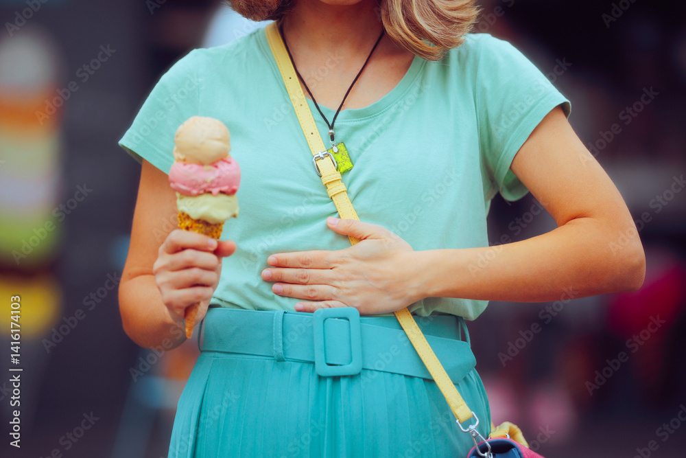 Lactose Intolerant Girl Holding an Ice Cream complaining of Stomachache. Person does not feel well after eating dairy products