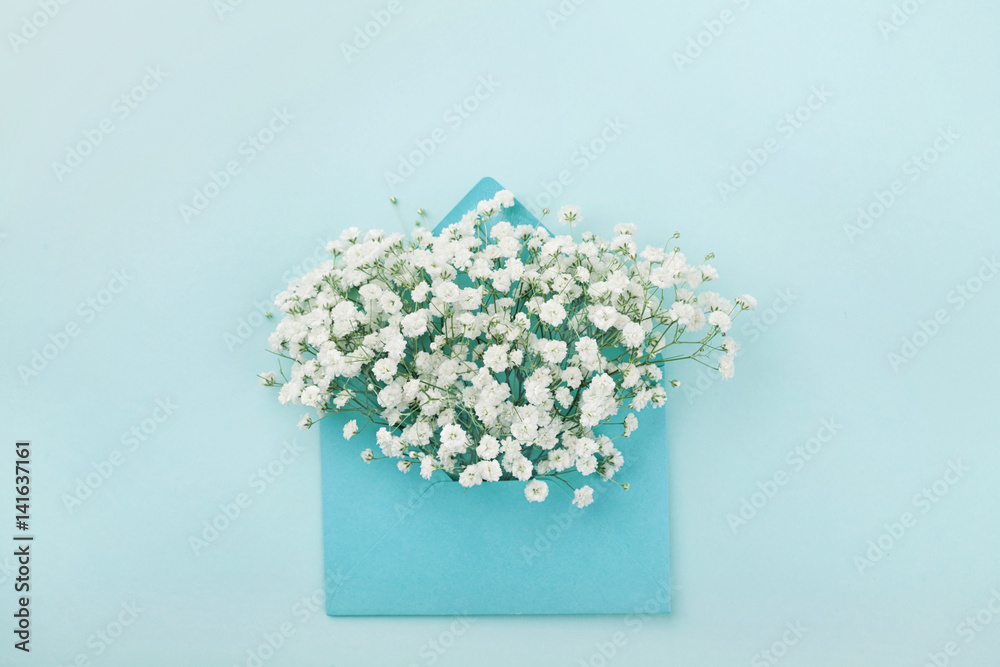 Mockup of gypsophila flowers in envelope on blue background top view in flat lay style.