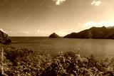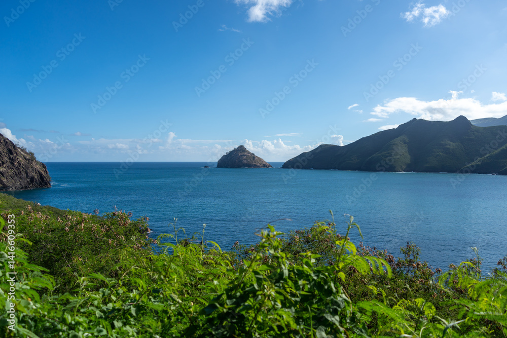 Cliffs and coastline of Taiohae Bay in Nuku Hiva, Marquesas Islands, French Polynesia