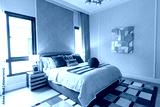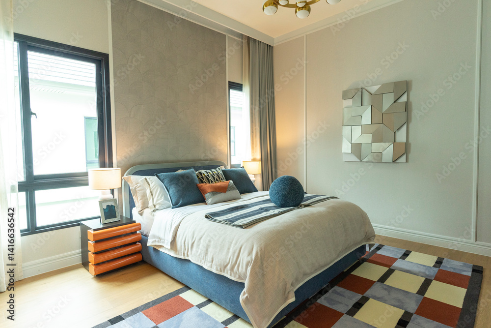 Modern cobalt blue bedroom with double bed with carpet and window.