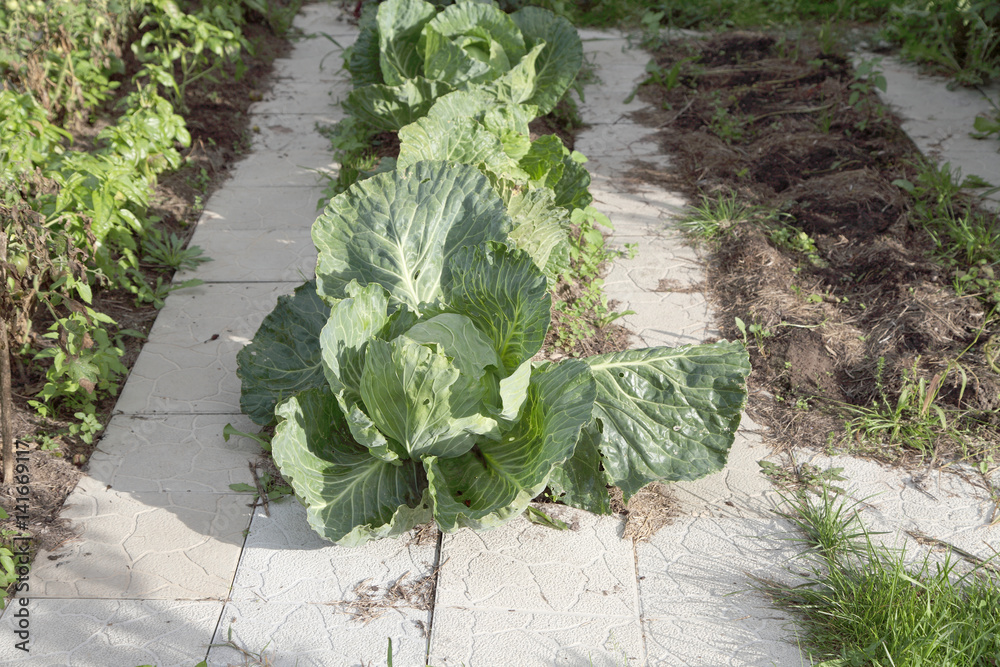 Cabbage grows on a bed, covered with mulch from dry grass. Summer garden day. End of the agricultural season.