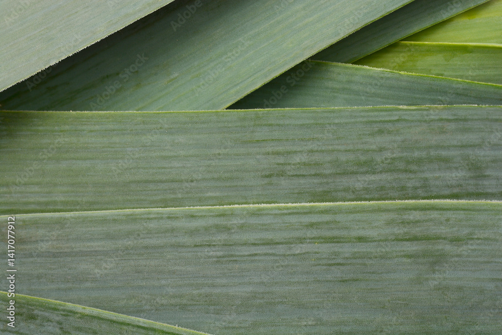 A close-up, top-down view of overlapping dark green leek leaves, showcasing their natural texture