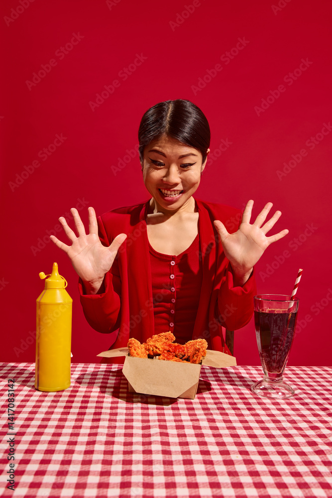 Excited young Asian woman with hands joyfully raised over crispy chicken nuggets in carton box with mustard and soda on checkered tablecloth. Food culture, pop art photography, human emotions concept