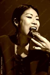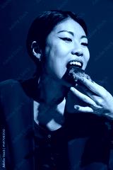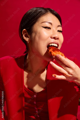 Close-up portrait of young Asian woman biting spicy chicken baguette with tomato sauce dripping from fingers against bright red background. Concept of food culture, pop art photography, human emotions