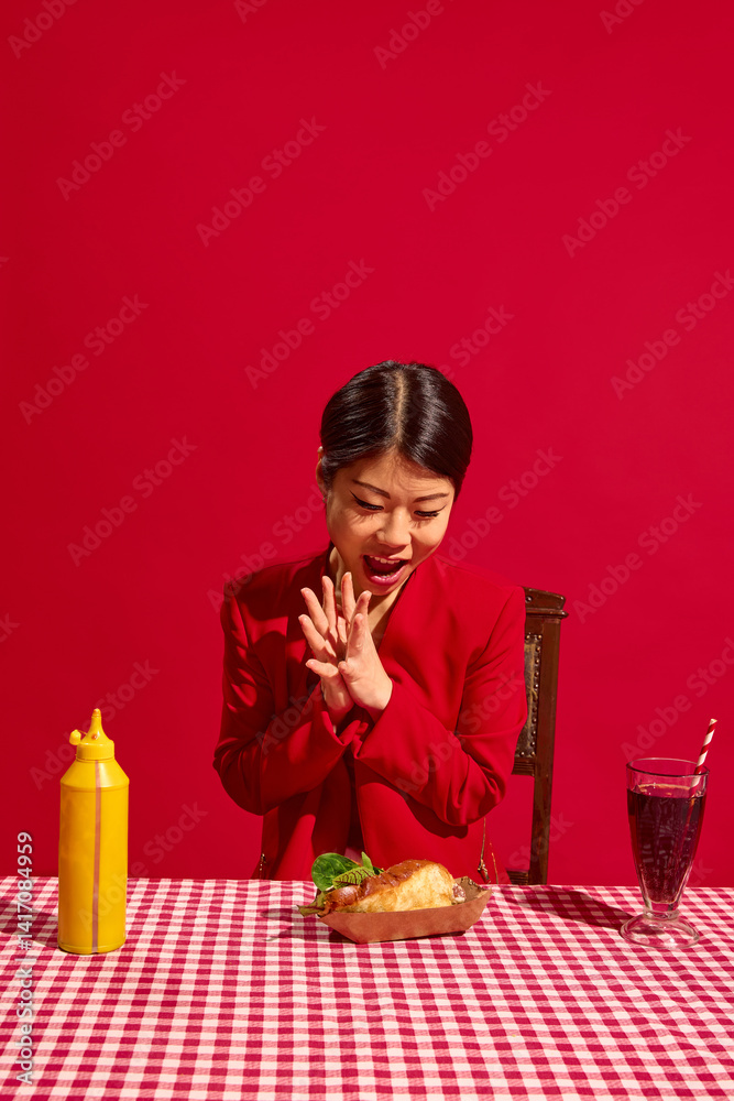 Excited woman in red suit stares at delicious hot dog on red-checkered table with mustard bottle and drink against bold red background. Concept of food culture, pop art photography, human emotions