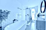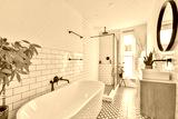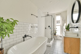 A contemporary bathroom featuring a stylish tub, elegant fixtures, and a touch of greenery that enhances the serene ambiance.