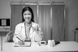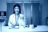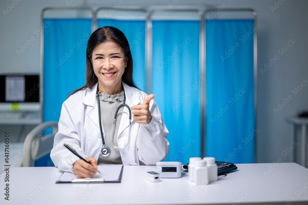 A woman in a white lab coat is smiling and pointing to something on a clipboard