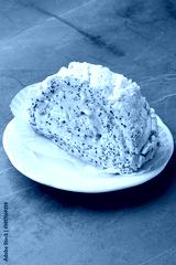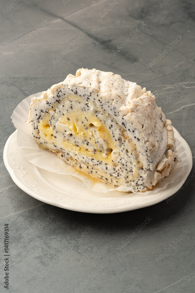 Deliciously crafted poppy seed cake roll with creamy filling served on a white plate