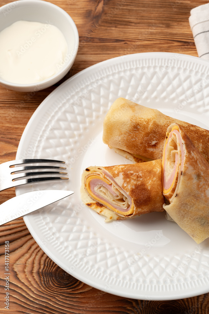 Savory crepes filled with ham and cheese served with a dollop of sour cream on a rustic wooden table