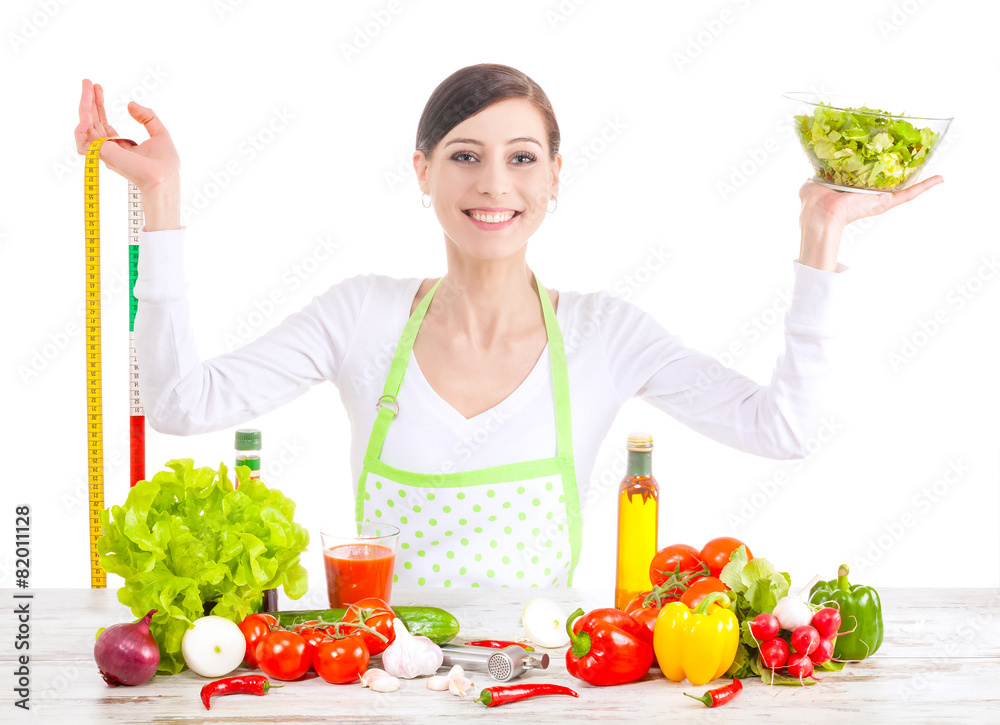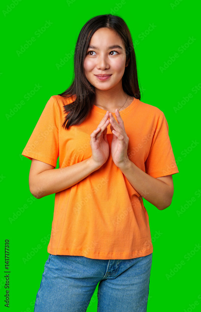 Young woman in orange t-shirt smiling and posing playfully against solid green background