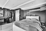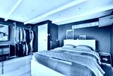 A stylish modern bedroom featuring a neatly made bed, a colorful blanket, and organized clothing in a wardrobe. The decor is contemporary and inviting.