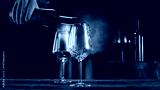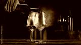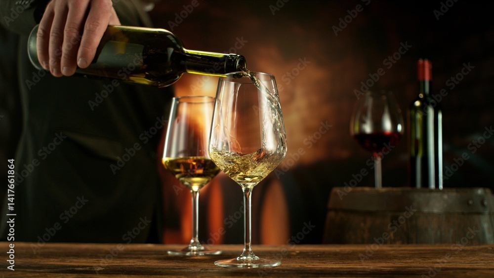 Detail of White Wine Pouring. Wine Cellar on Background.