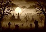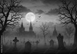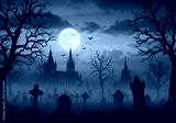 Spooky Graveyard with Gothic Castle under Full Moon at Night