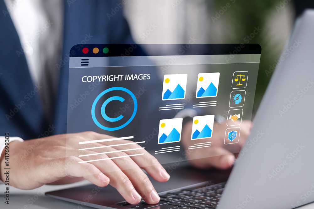 Copyright images concept. Rights of ownership of images, rights to publish, modify and distribute images. Businessman using laptop with sells images to customer.