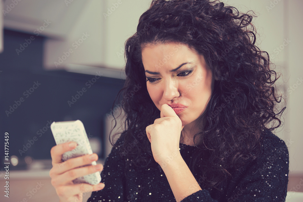 Upset confused young woman suing mobile phone reading text message