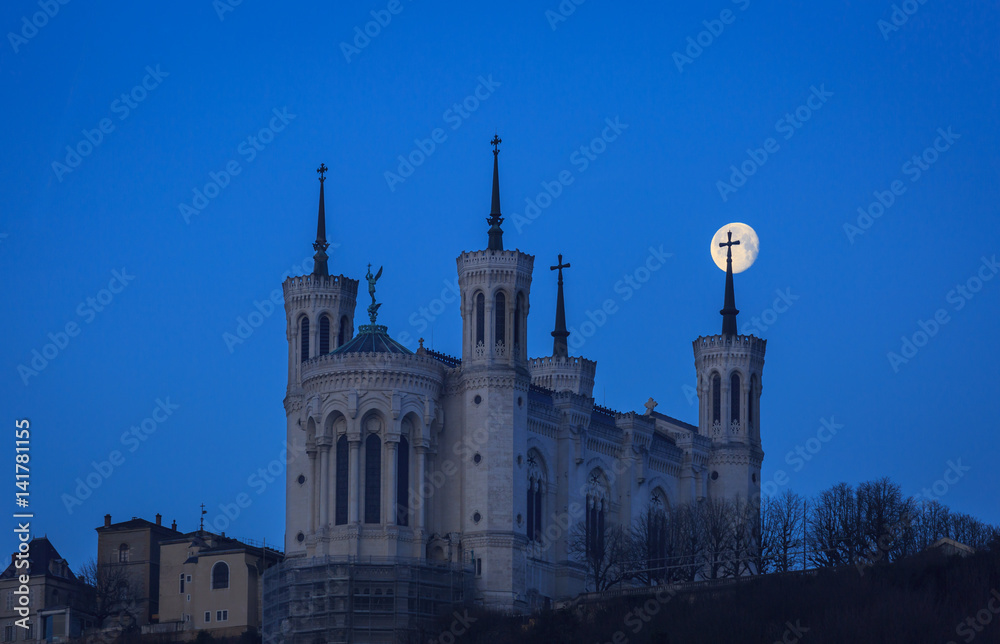 Moon and Cathedral Notre-Dame de Fourviere on top of Fourviere hill in Lyon, France.