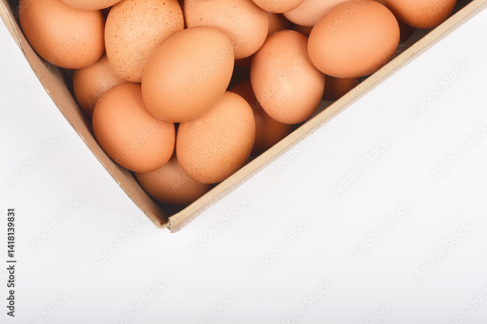 A top-down, partial view shows brown chicken eggs in a cardboard carton against a white background with ample copy space