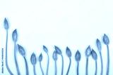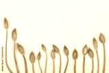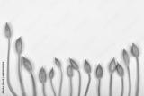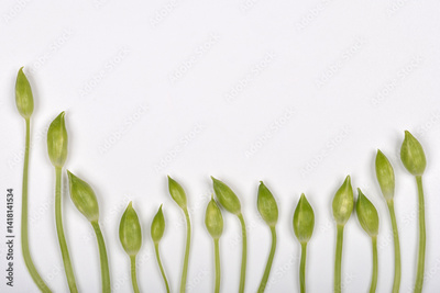 A top-down shot shows a curved arrangement of fresh, green wild garlic (Allium ursinum) flower buds along the bottom of a white surface with ample copy space above