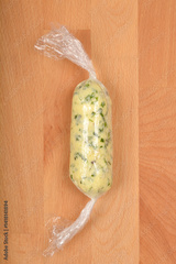 A top-down shot shows a log of herbed butter fully wrapped in clear plastic wrap on a wooden surface