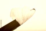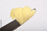 A close-up shot shows a curl of yellow butter on a serrated knife blade against a blurred white background