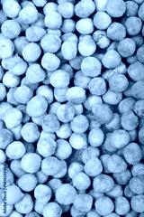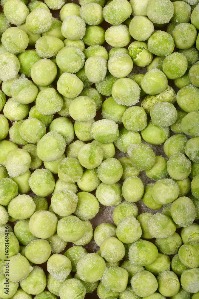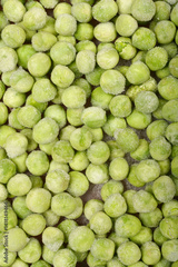 A close-up, top-down shot shows a dense layer of frozen green peas, some with visible ice crystals