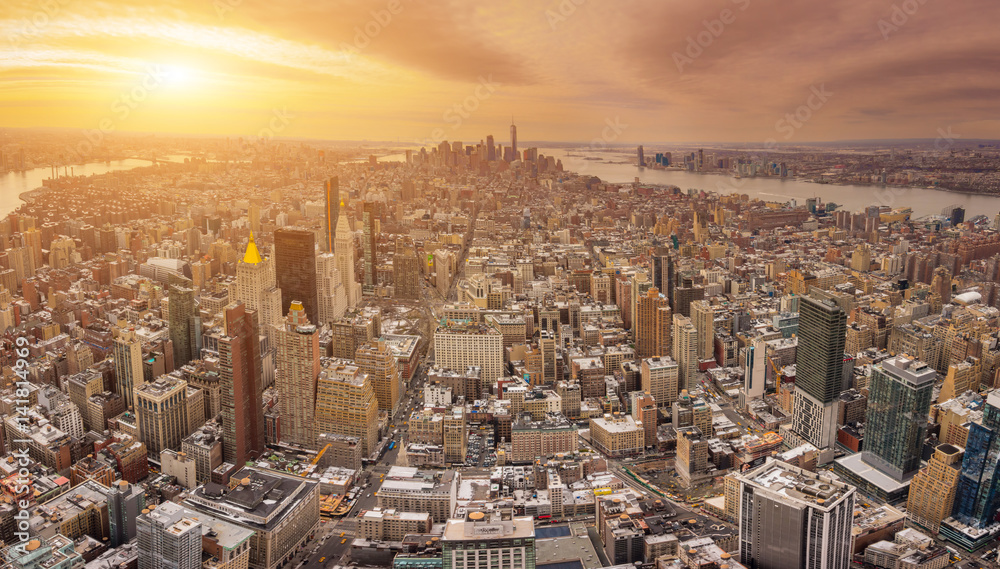 The New York City USA .Manhattan downtown and New Jersey skyline skyscrapers at sunset with the Freedom tower and Brooklyn bridge. Extreme Panorama