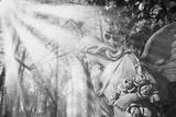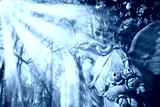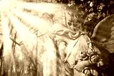 Majestic view of statue of golden angel illuminated by sunlight against a background of dark foliage. Dramatic unusual scene. Retro filter and vintage style.