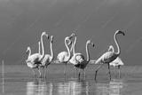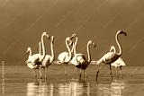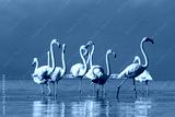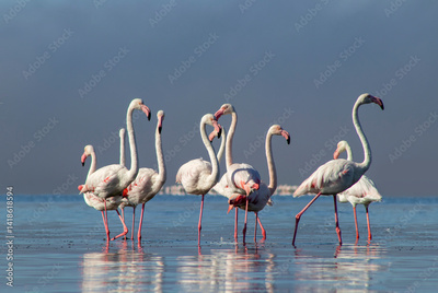 A stunning view of pink flamingos standing gracefully by a calm lake under a bright blue sky. Perfect for nature, wildlife, and travel projects, showcasing the beauty of exotic birds