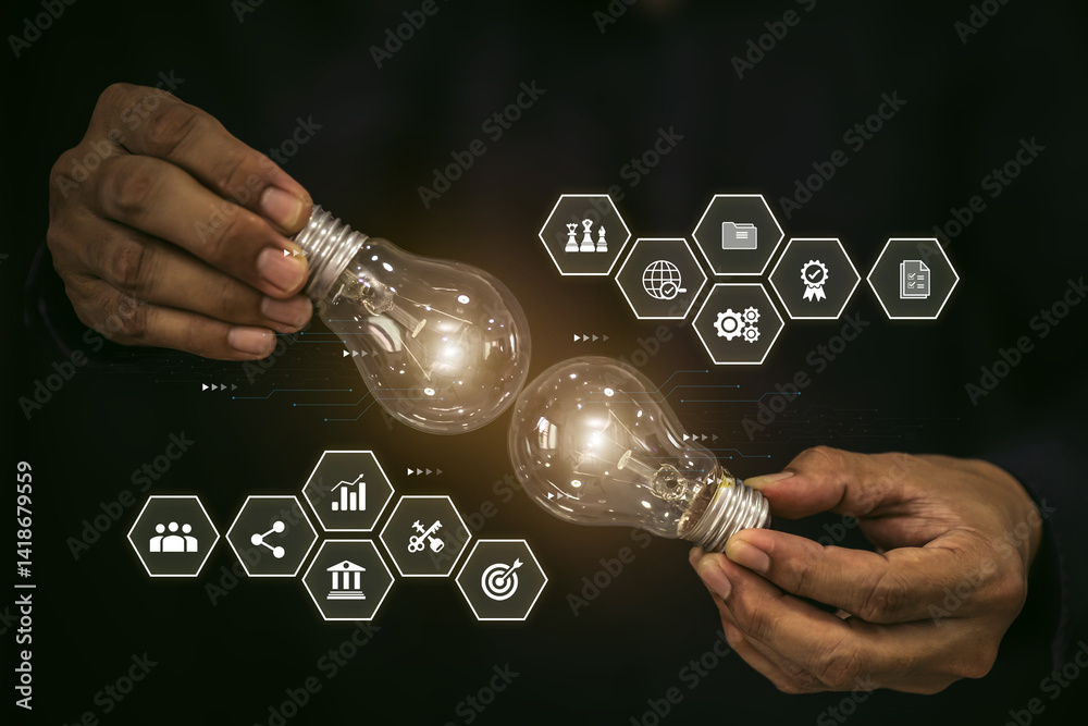 Hand chooses light bulb with business plan icons for goal and creative idea innovation or study education or analyzing marketing data management and target growth or human resources concept.