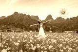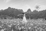 Young happy woman tourist enjoying the canola fields and mountains while traveling in Wanfenglin, China