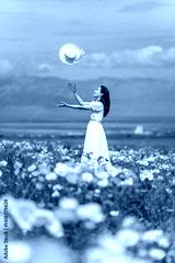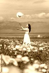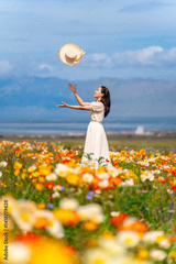 Young woman traveler relaxing and enjoying at beautiful blooming poppy flower fields at sayram lake in Xinjiang, China