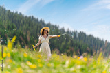 Young woman traveler relaxing and enjoying at beautiful blooming flower fields