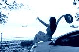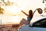 Happy young woman relaxing and enjoying watching a beautiful sunset at the beach, Road trip on summer vacation concept