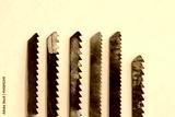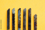 Carpentry saw blade teeth set. Rusty textured woodworking instrument on yellow paper background, shallow depth of field.