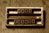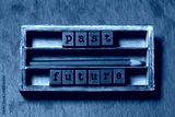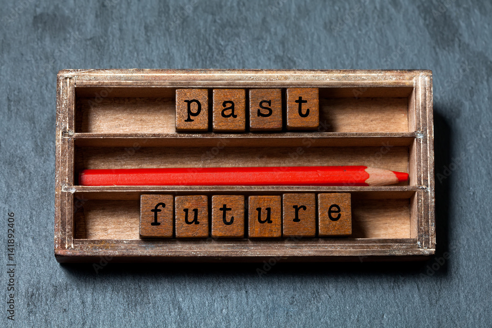 Past future concept. Vintage box, wooden cubes phrase with old style letters, old red pencil. Gray stone textured background. Close-up, up view, soft focus