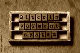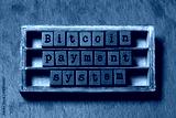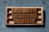 Bitcoin payment system concept. Vintage box, wooden cubes phrase with old style letters. Gray stone textured background. Close-up, up view, soft focus