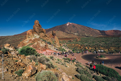 Volcanic landscape with tourists visiting volcano of Teide in Teide National park on Tenerife island, Spain
