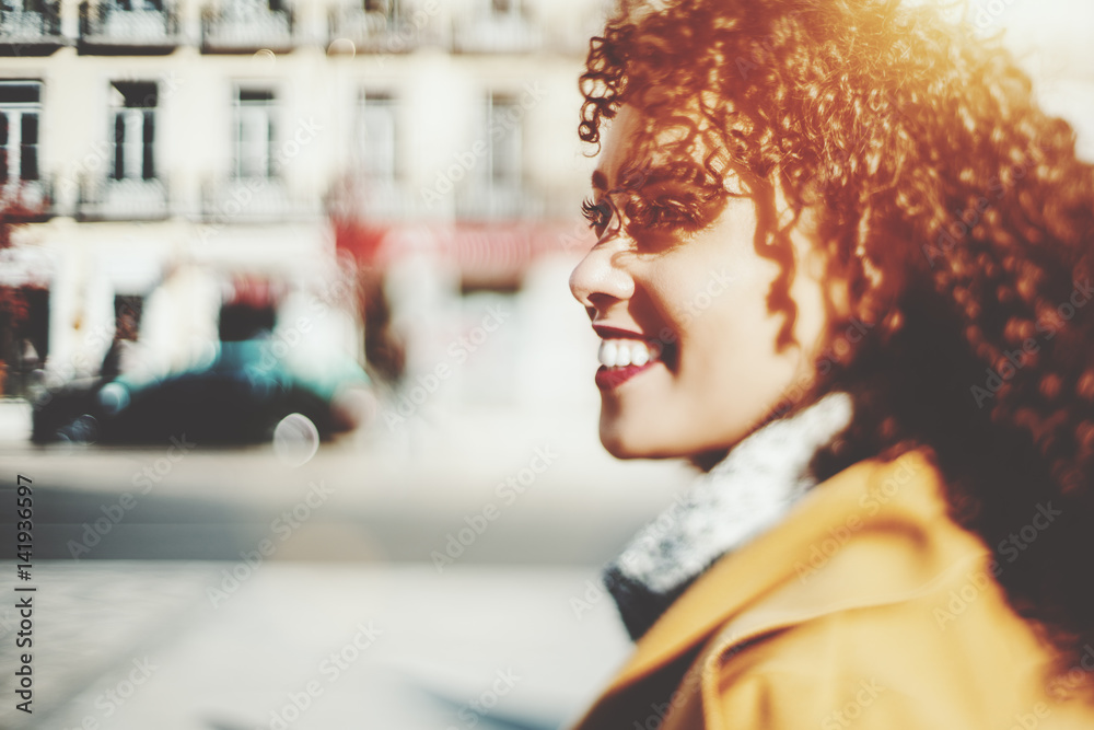 True tilt shift shooting of beautiful smiling Brazilian woman with curly hair and yellow coat looking away, blurred background with strong bokeh with copy space for young advertising text message