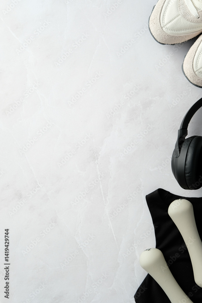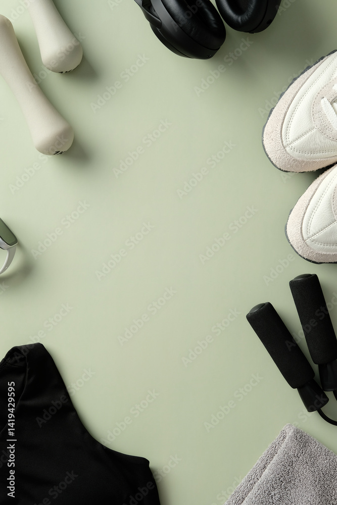 Fitness equipment flat lay on green: dumbbells, headphones, sneakers, tracker, towel, jump rope, top. Workout, gym, active lifestyle concept.