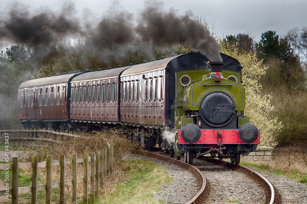 A steam train locomotive traveling forward with smoke emerging from the funnel.